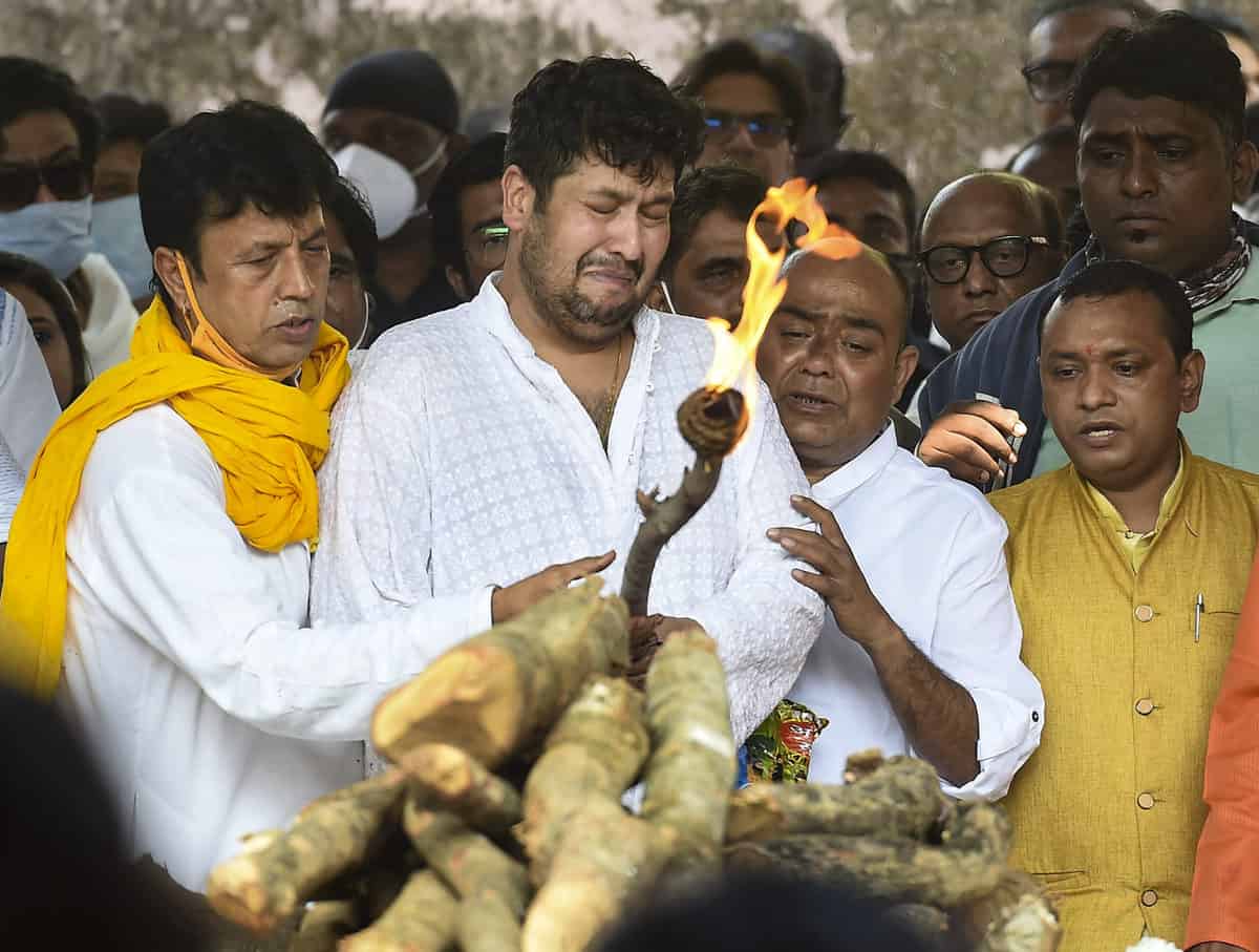 Mumbai: Son Bappa and other family members and relatives during the funeral of music composer Bappi Lahiri, in Mumbai, Thursday, Feb. 17, 2022. (PTI Photo/Kunal Patil)
