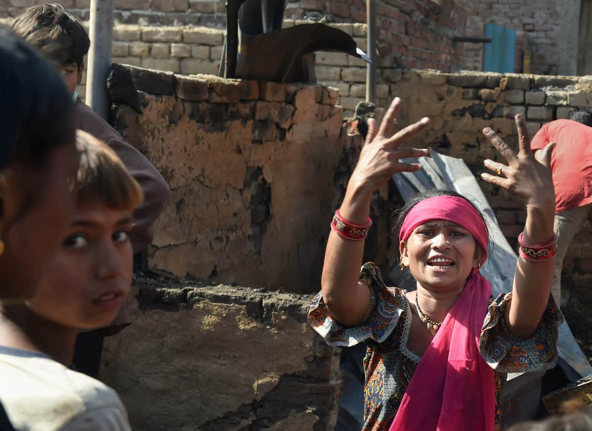 New Delhi: A woman reacts as she stands near charred remains of houses, after a fire broke out in shanties at c, in New Delhi, Saturday morning, March 12, 2022. Seven people were killed and at least 60 shanties were affected. (PTI Photo/Atul Yadav)