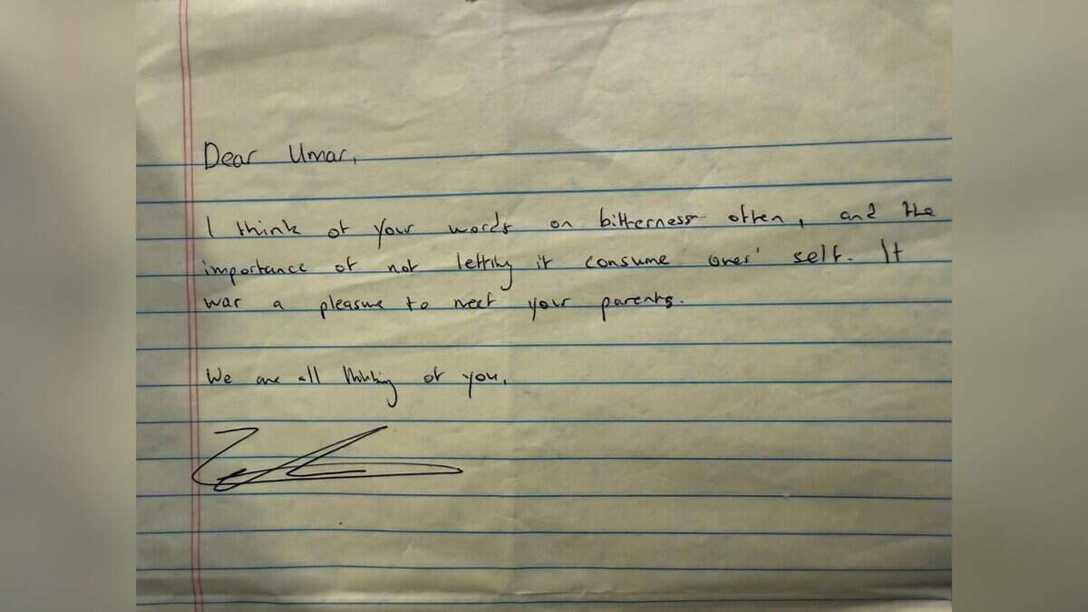 In the letter, Mamdani said he often thinks about Khalid’s words on bitterness and the need not let it take over one’s life. He also wrote that it was a pleasure to meet Khalid’s parents.