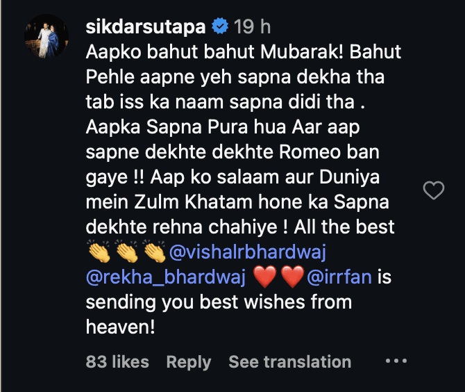 She congratulated Bhardwaj and wrote that Irrfan is sending his blessings from heaven. Fans became emotional remembering the special bond between the director and the late actor.