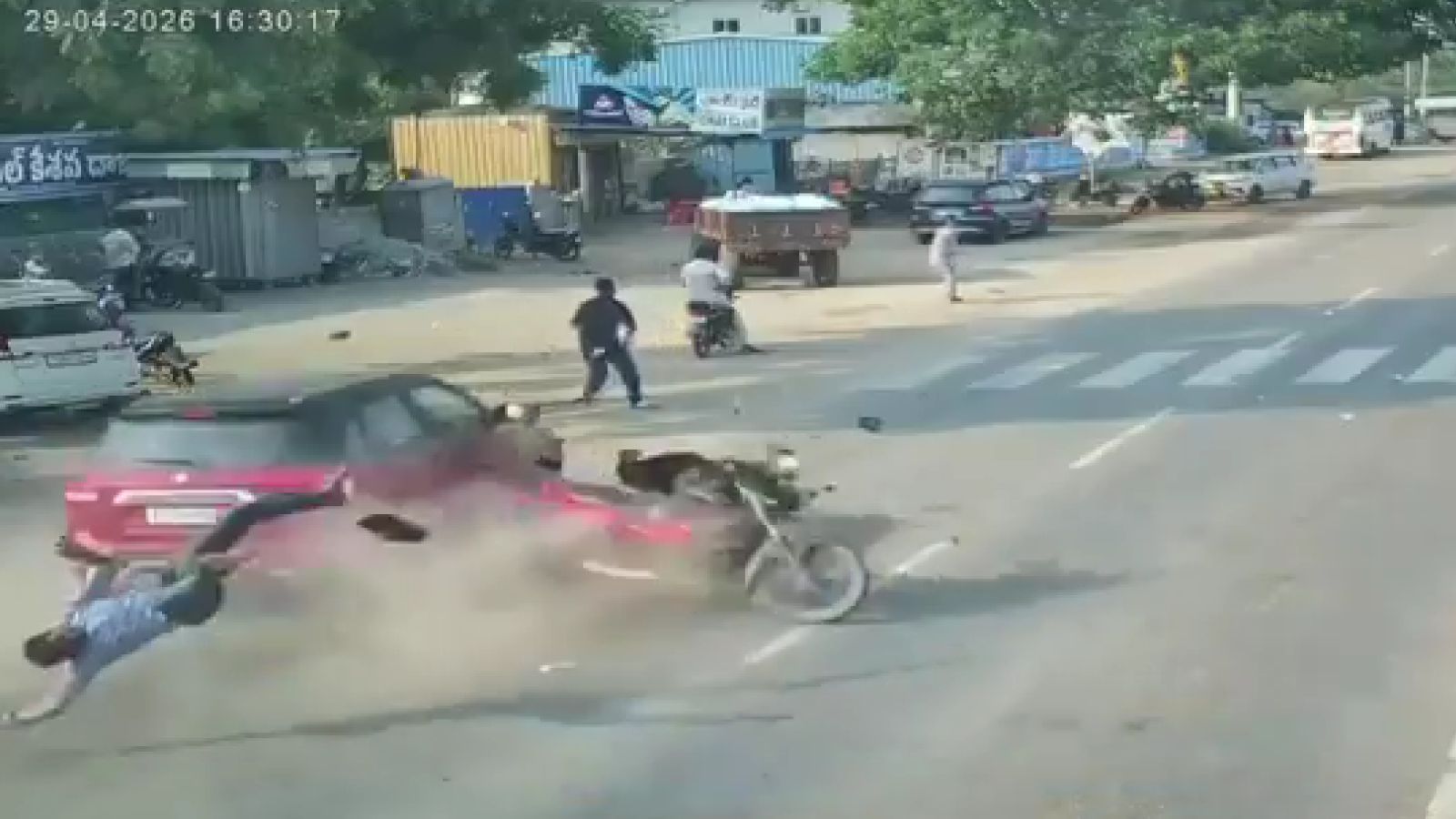In a video of the incident that surfaced on social media, the biker is seen attempting to cross the road from the wrong side when a speeding car crashes into him, before ploughing into another stationary motorcycle with a man seated on it. Two other individuals standing by the roadside were also struck in the impact.