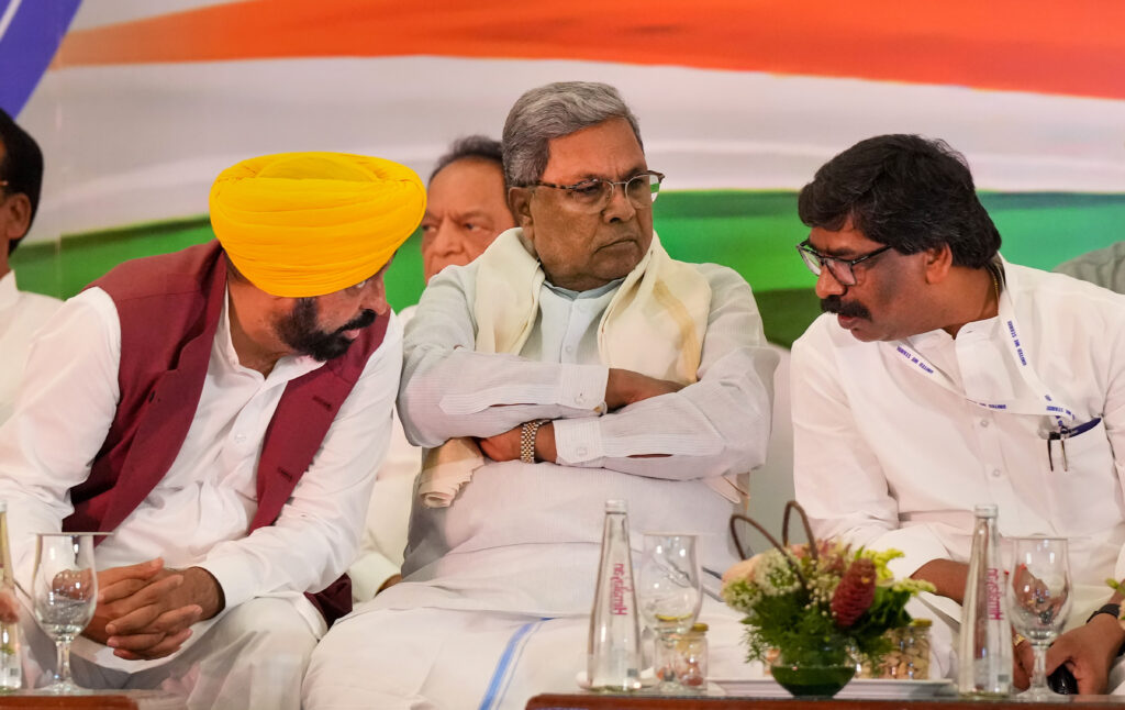 Bengaluru: Jharkhand CM Hemant Soren, Karnataka CM Siddaramaiah and Punjab CM Bhagwant Mann at a joint press conference after the opposition parties meeting, in Bengaluru, Tuesday, July 18, 2023. The opposition alliance will be called Indian National Developmental Inclusive Alliance (INDIA) and an 11-member committee will be set up for coordination, Congress president Mallikarjun Kharge announced on Tuesday. (PTI Photo/Shailendra Bhojak)