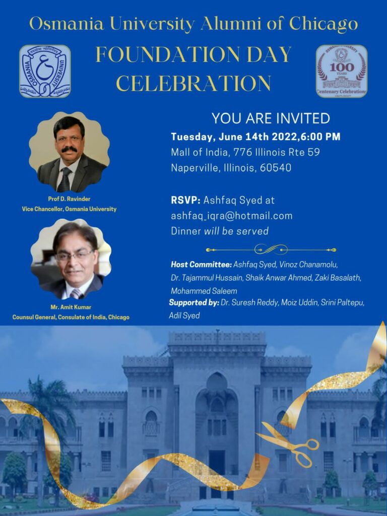 “Osmania University Alumni of Chicago” is organizing “Foundation Day Celebrations of Osmania University”, at 6 pm on June 14, 2022, at Mall of India, 776 Il Rte 59, IL 60540.