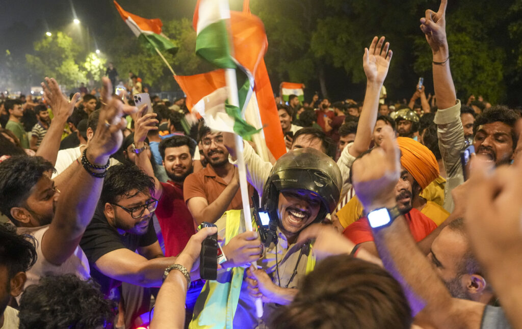 New Delhi: Fans celebrate on a road near the India Gate after India won the T20 World Cup 2024, in New Delhi, early Sunday, June 30, 2024. (PTI Photo/Ravi Choudhary)