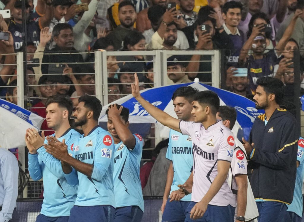 Ahmedabad: Gujarat Titans players acknowledge fans after the Indian Premier League (IPL) 2024 cricket match between Gujarat Titans and Kolkata Knight Riders was abandoned due to bad weather, at Narendra Modi Stadium in Ahmedabad, Monday, May 13, 2024. (PTI Photo/Kamal Kishore)(PTI05_13_2024_000589B)Ahmedabad: Gujarat Titans players acknowledge fans after the Indian Premier League (IPL) 2024 cricket match between Gujarat Titans and Kolkata Knight Riders was abandoned due to bad weather, at Narendra Modi Stadium in Ahmedabad, Monday, May 13, 2024. (PTI Photo/Kamal Kishore)(PTI05_13_2024_000583B)Ahmedabad: Gujarat Titans captain Shubman Gill with teammates acknowledges fans after the Indian Premier League (IPL) 2024 cricket match between Gujarat Titans and Kolkata Knight Riders was abandoned due to bad weather, at Narendra Modi Stadium in Ahmedabad, Monday, May 13, 2024. (PTI Photo/Kamal Kishore)(PTI05_13_2024_000582B)Ahmedabad: Gujarat Titans players acknowledge fans after the Indian Premier League (IPL) 2024 cricket match between Gujarat Titans and Kolkata Knight Riders was abandoned due to bad weather, at Narendra Modi Stadium in Ahmedabad, Monday, May 13, 2024. (PTI Photo/Kamal Kishore)(PTI05_13_2024_000578B)Ahmedabad: Gujarat Titans captain Shubman Gill with teammates acknowledges fans after the Indian Premier League (IPL) 2024 cricket match between Gujarat Titans and Kolkata Knight Riders was abandoned due to bad weather, at Narendra Modi Stadium in Ahmedabad, Monday, May 13, 2024. (PTI Photo/Kamal Kishore)(PTI05_13_2024_000577B)