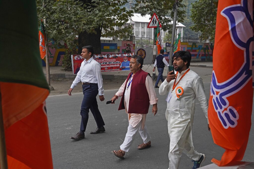 Scores of BJP supporters attended PM’s rally in Srinagar, Thursday, September 19, 2024 (Photo: Muzamil Bhat/Siasat.com)Youth walking outside SK stadium in Srinagar to attend PM’s rally, Thursday, September 19, 2024 (Photo: Muzamil Bhat/Siasat.com)Kashmiris holding the BJP flag during PM’s rally in Srinagar, Thursday, September 19, 2024 (Photo: Muzamil Bhat/Siasat.com)BJP supporters wearing Modi mask as they head towards SK stadium, Thursday, September 19, 2024 (Photo: Muzamil Bhat/Siasat.com)
