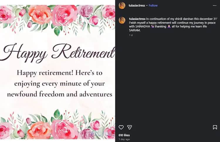 Before confirming her retirement, Tulasi had shared a spiritually inclined post featuring a photo of Sai Baba’s feet, captioned: “Guard and guide me and my son Sai!! Oh deva oh Sainadha.” This hinted at a major life change, which she later affirmed in a follow-up note.