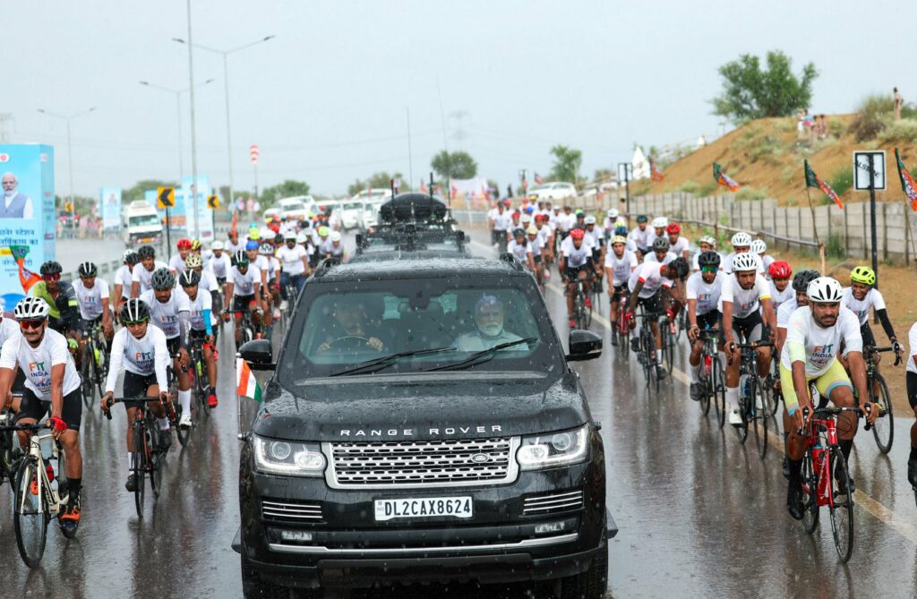 Bikaner: Prime Minister Narendra Modi’s convoy moves along a platoon of cyclists during a roadshow in Bikaner, Saturday, July 8, 2023. (PTI Photo)