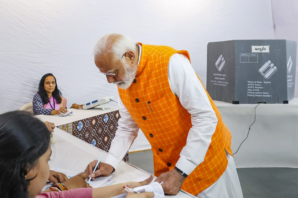 Ahmedabad: Prime Minister Narendra Modi casts his vote at a polling station during the third phase of Lok Sabha elections, in Ahmedabad, Tuesday, May 7, 2024. (PTI Photo)