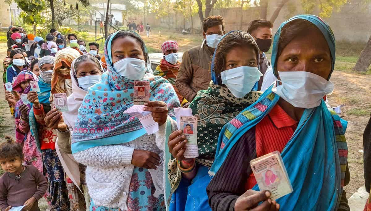 Bathinda: Women holding their identification cards, stand in a queue to cast their votes, during the Punjab Assembly elections, in Bathinda, Sunday, Feb. 20, 2022. (PTI Photo)