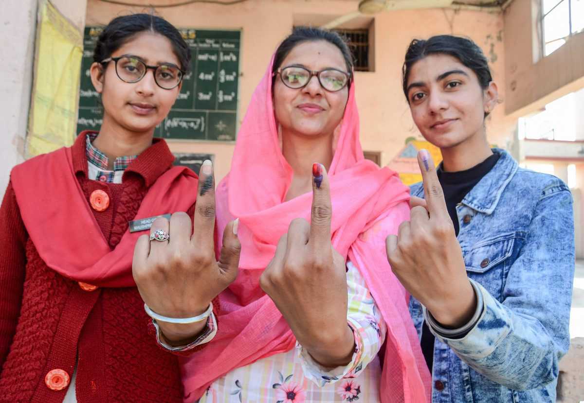 Amritsar: First time voters show their fingers marked with indelible ink after casting vote during the Punjab polls, in Amritsar, Sunday, Feb. 20, 2022. (PTI Photo)