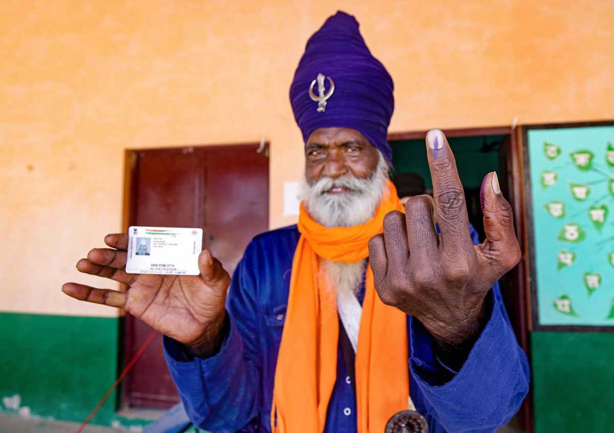 Amritsar: Nihang Singh shows his identification card and inked finger, after casting his vote during the Punjab assembly elections, in Amritsar, Sunday, Feb. 20, 2022. (PTI Photo)