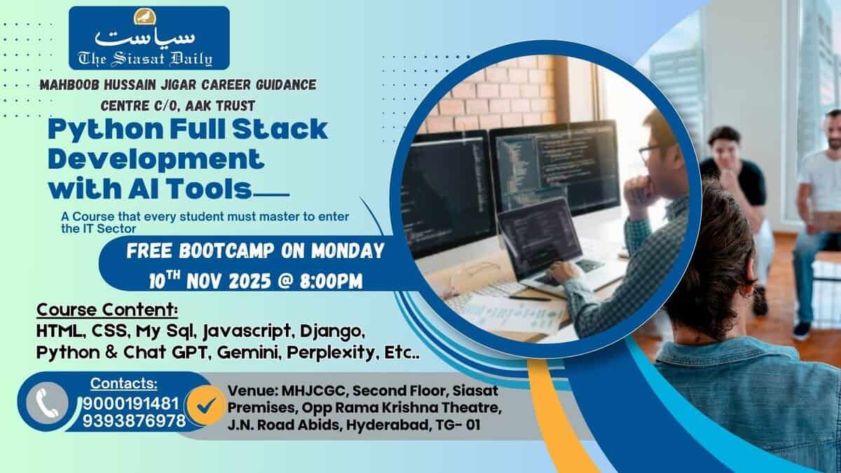 Hyderabad: The Siasat’s Mahboob Hussain Jigar Career Guidance Centre has announced the beginning of free introductory classes of the Python with AI tools course for job readiness in Hyderabad.