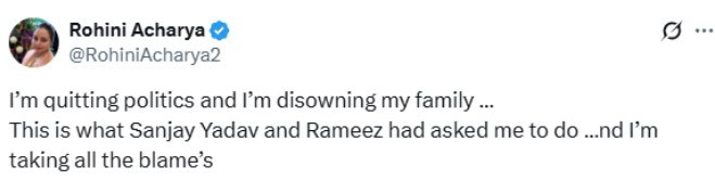 Patna: A day after the RJD was drubbed in the Bihar assembly polls, party president Lalu Prasad’s daughter Rohini Acharya on Saturday announced that she was “quitting politics” and severed ties with the family.