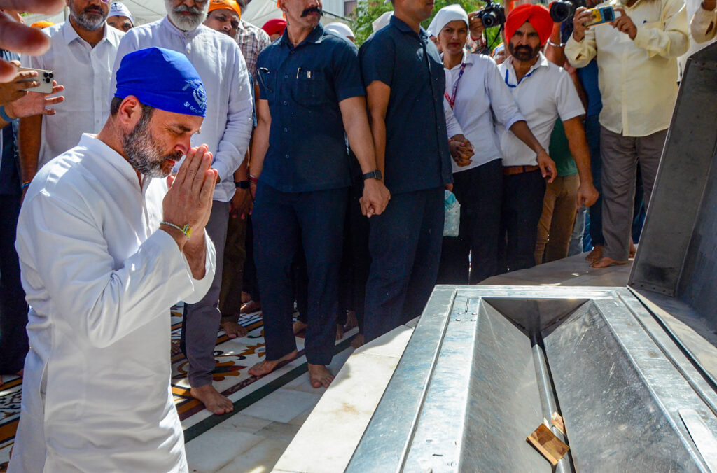 Amritsar: Congress leader Rahul Gandhi during a visit to the Golden Temple, in Amritsar, Monday, Oct. 2, 2023. (PTI Photo) Amritsar: Congress leader Rahul Gandhi pays obeisance at the Golden Temple, in Amritsar, Monday, Oct. 2, 2023. (PTI Photo) Amritsar: Congress leader Rahul Gandhi offers prayers at the Golden Temple, in Amritsar, Monday, Oct. 2, 2023. (PTI Photo) Amritsar: Congress leader Rahul Gandhi offers prayers at the Golden Temple, in Amritsar, Monday, Oct. 2, 2023. (PTI Photo) Amritsar: Congress leader Rahul Gandhi pays obeisance at the Golden Temple, in Amritsar, Monday, Oct. 2, 2023. (PTI Photo) TagsCongress Golden Temple Photos Rahul Gandhi Press Trust of India Follow on Twitter | Posted by Mansoor Hameed | Published: 3rd October 2023 12:20 am IST Facebook X LinkedIn Pinterest Messenger Messenger WhatsApp Telegram