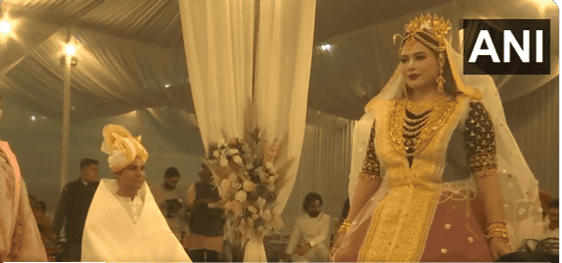 Randeep was spotted wearing a white shawl. Lin was dressed in a Potloi or Polloi, a cylindrical skirt made up of thick cloth and bamboo. It is ornamented with satin and velvet material, as well as gems and glitter.