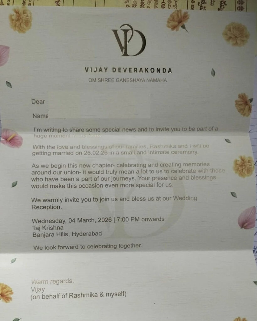 The viral invite reads: “I’m writing to share some special news and to invite you to be part of a huge moment. With the love and blessings of our families, Rashmika and I will be getting married on 26.02.26 in a small and intimate ceremony.”