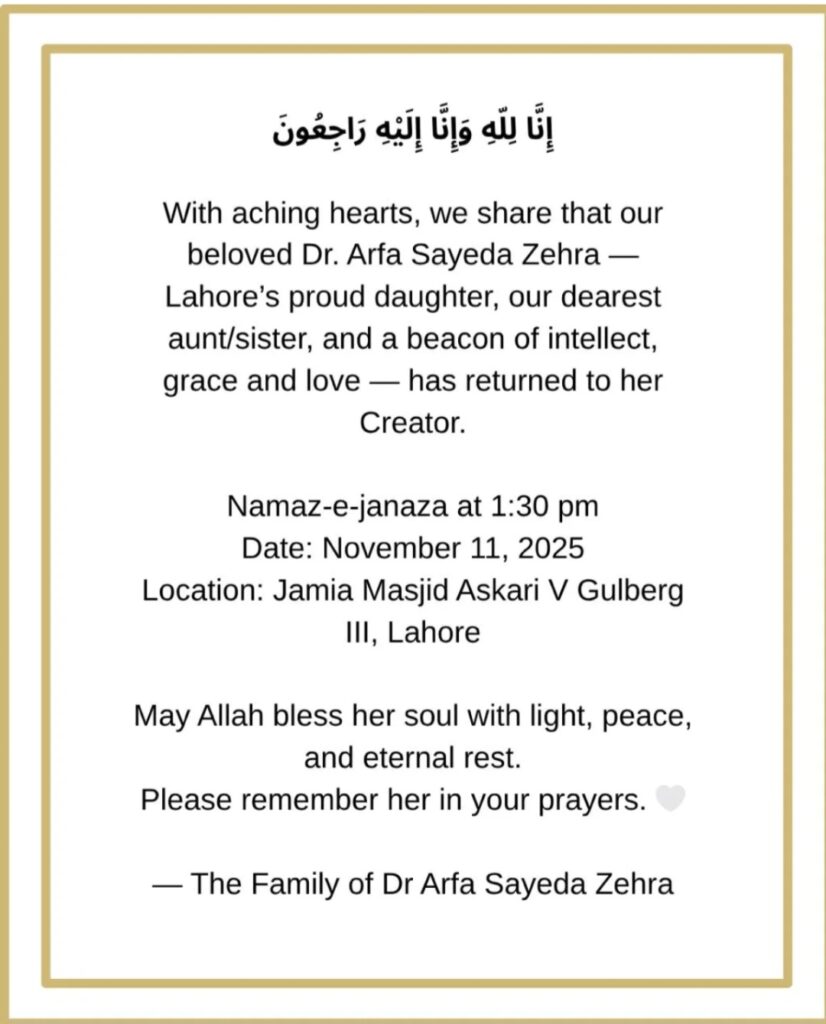 According to a statement issued by her family, “With aching hearts, we share that our beloved Dr Arfa Sayeda Zehra — Lahore’s proud daughter, our dearest aunt/sister, and a beacon of intellect, grace and love — has returned to her Creator.”