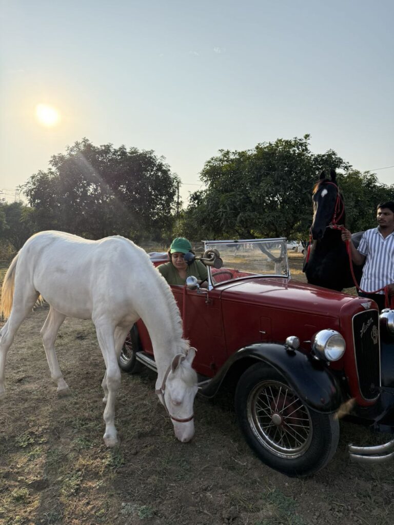 Back at the farmhouse, the experience turns leisurely. Visitors can relax with refreshments and explore the property, which offers several photo opportunities beside vintage cars displayed on the grounds. Beyond horses, the ranch is home to birds, ducks, turtles, and other small animals, creating a wholesome farm atmosphere for families.