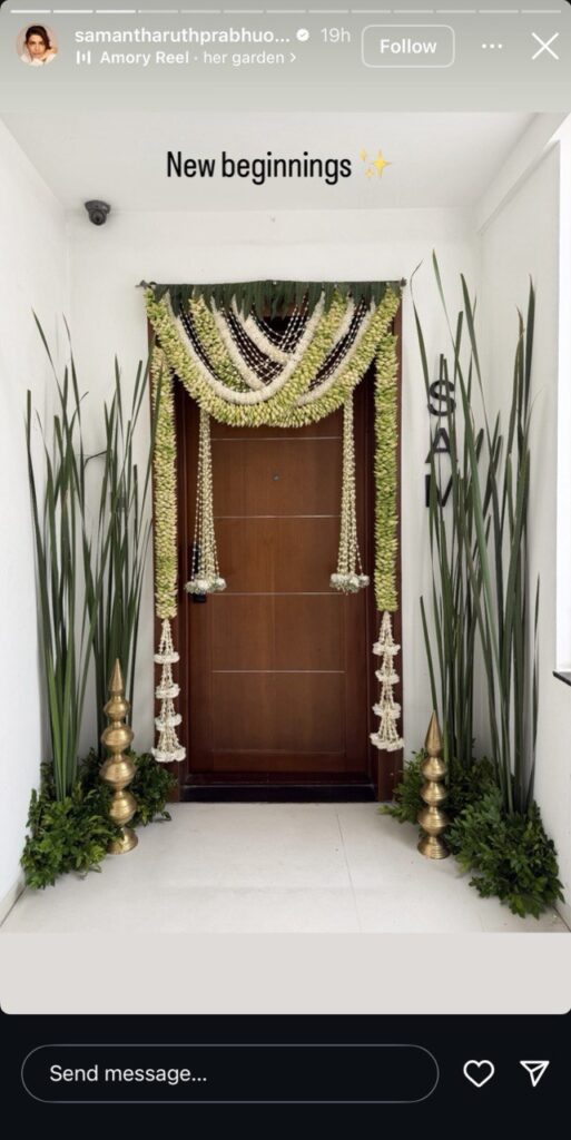 Hyderabad: On the occasion of Dussehra, actress Samantha Ruth Prabhu surprised her fans with a special update. She shared a photo on social media, captioned “New Journey.” The picture showed the front wall of her new house, decorated with her nickname logo “SAM,” which immediately caught attention.