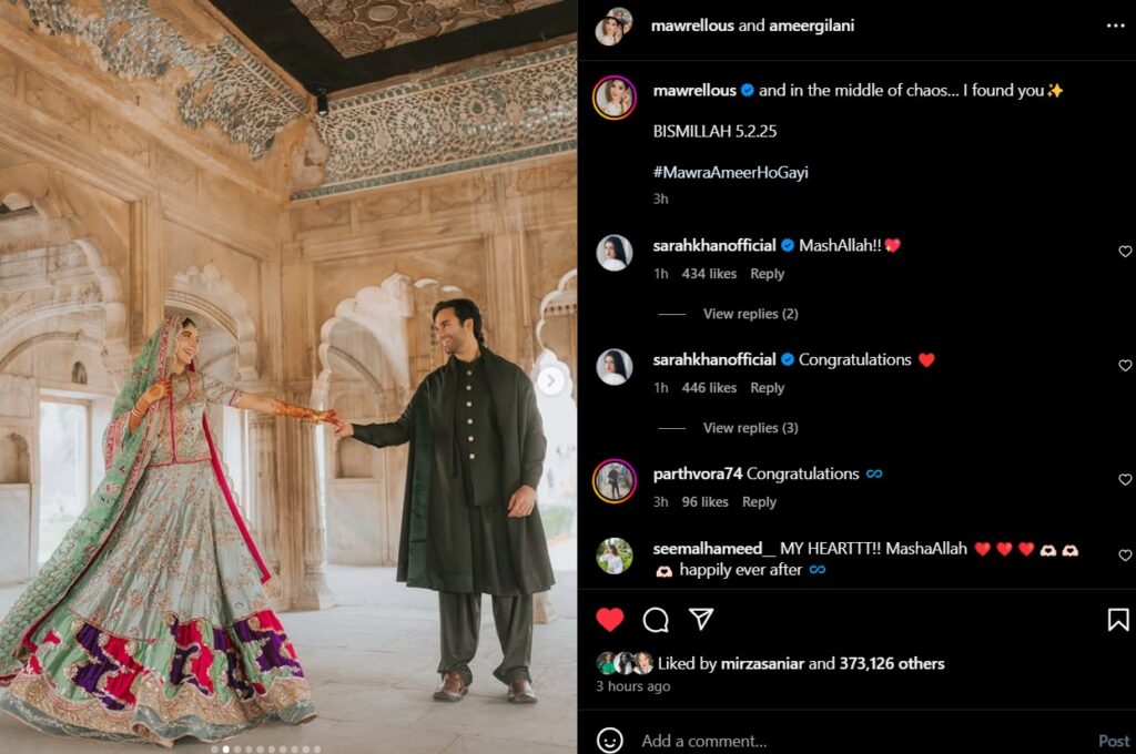 The newlyweds took to Instagram to share their joy, treating fans to dreamy wedding pictures. Captioning the post, Mawra wrote, “And in the middle of chaos… I found you BISMILLAH 5.2.25 #MawraAmeerHoGayi.”