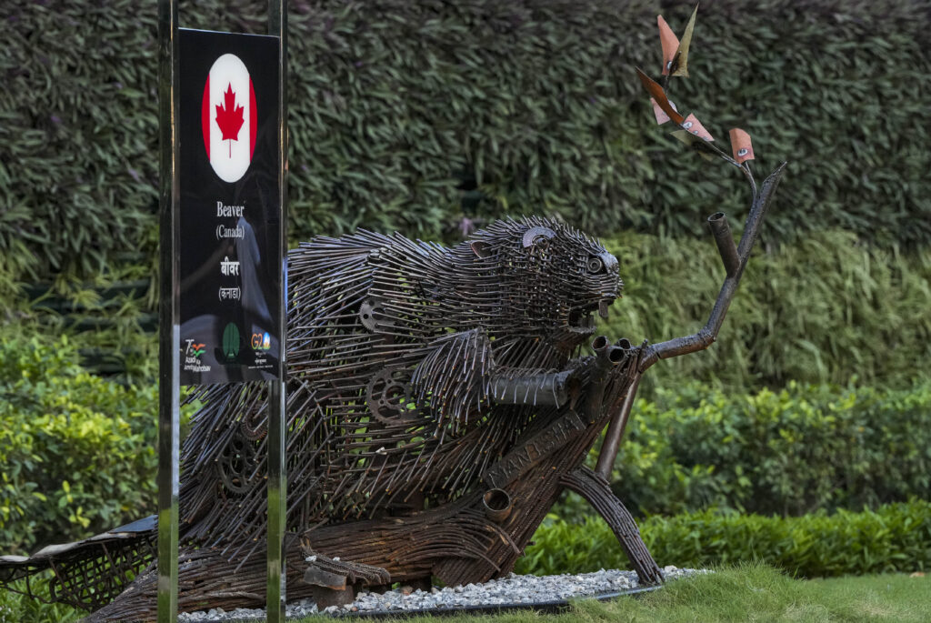 New Delhi: Canada’s national animal beaver sculpture, made from scrap metal, installed in preparations for the G20 Summit, at G20 Park, Chanakyapuri, in New Delhi, Monday, Sept 4, 2023. (PTI Photo/Atul Yadav)