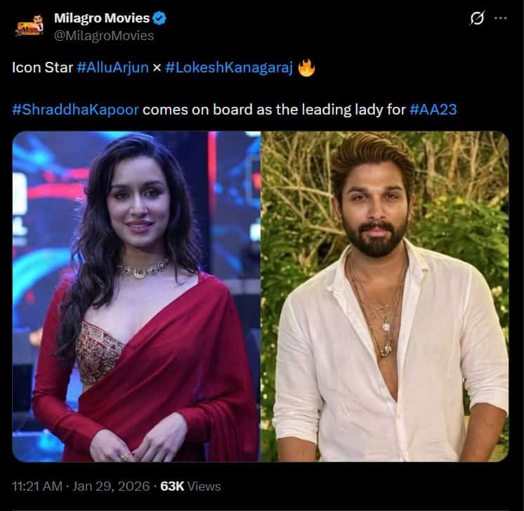 Hyderabad: Fans love watching fresh onscreen pairings, and the latest buzz has given them a major reason to cheer. Bollywood star Shraddha Kapoor is reportedly set to share screen space with Allu Arjun in his upcoming film AA23, directed by Lokesh Kanagaraj.