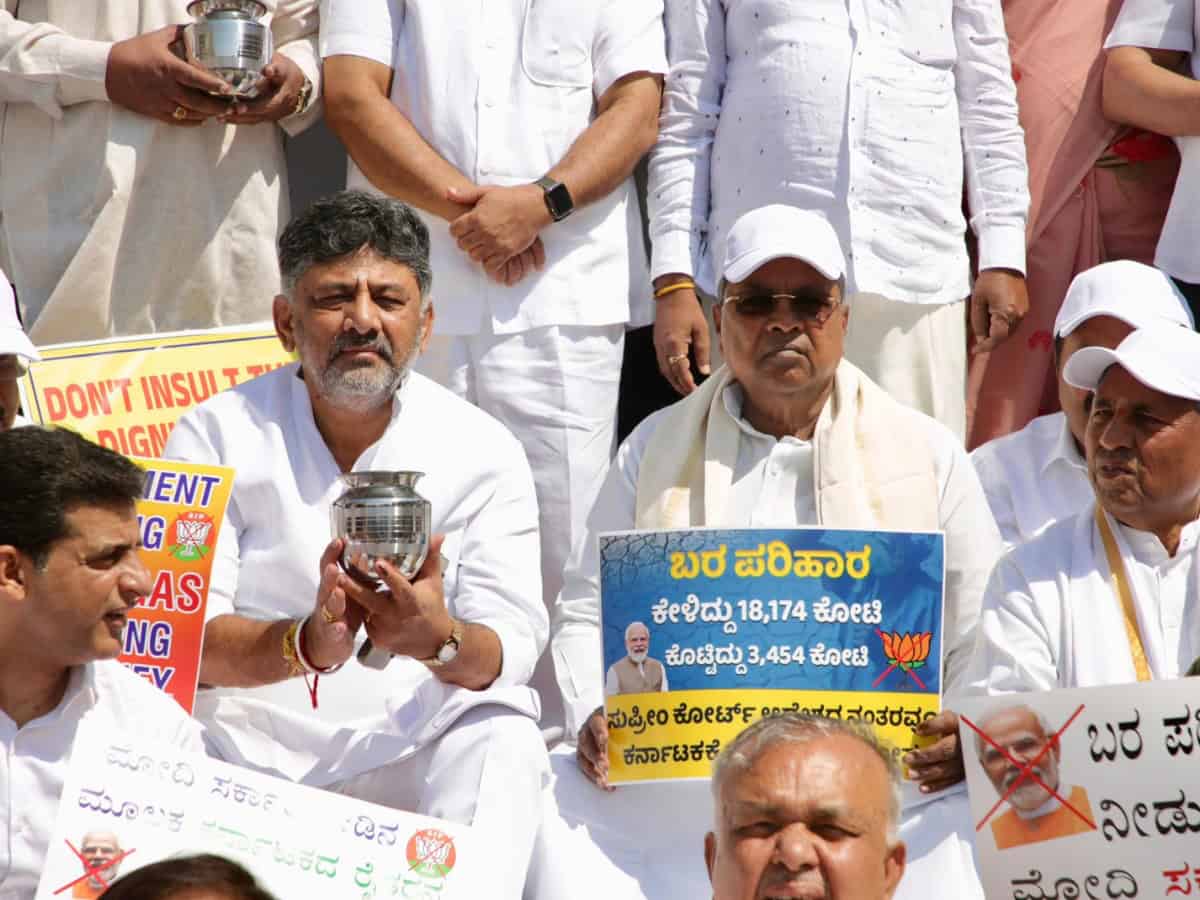 Bengaluru: Karnataka Chief Minister Siddaramaiah, his deputy D K Shivakumar along with several ministers and legislators on Sunday staged a dharna here, alleging injustice done to the state by the union government while releasing the drought relief funds.