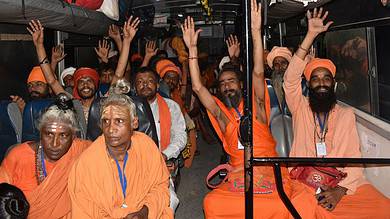Jammu: Sadhua shout religious slogans after boarding a bus as the first batch of pilgrims leaves for the Amarnath Yatra 2023, in Jammu, Friday, June 30, 2023. (PTI Photo) Jammu: Pilgrims shout…