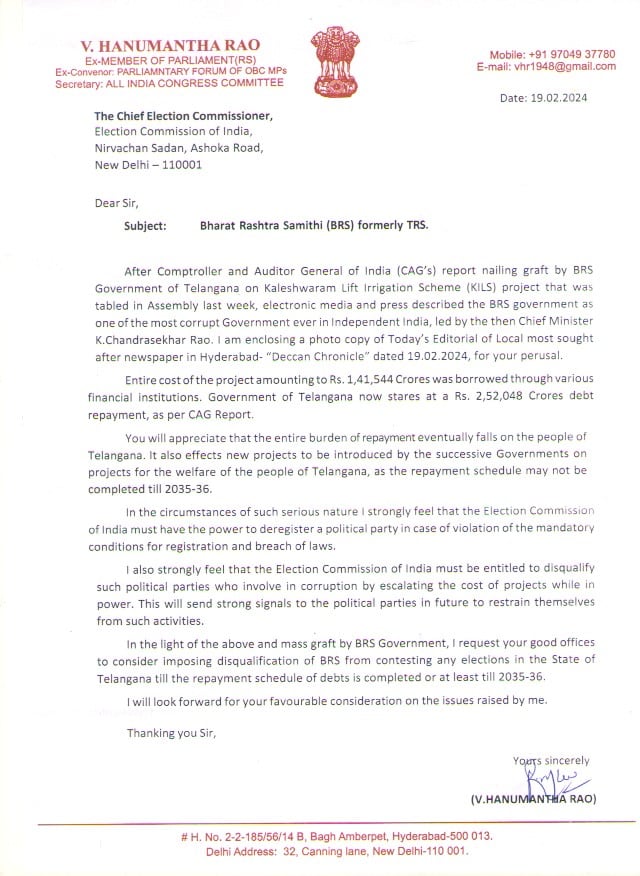 Hyderabad: In a letter to the Election Commission of India (ECI), former MP V. Hanumantha Rao has raised concerns over the Bharat Rashtra Samithi (BRS) government’s alleged corruption in the Kaleshwaram Lift Irrigation Scheme (KILS) project. His letter advocates for the disqualification of the BRS from participating in elections in Telangana until the debt is fully repaid or at least until the year 2035-36.