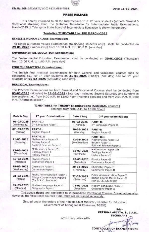 Hyderabad: The Board of Intermediate Education has announced intermediate first-year examinations will be held from March 5 to 20.