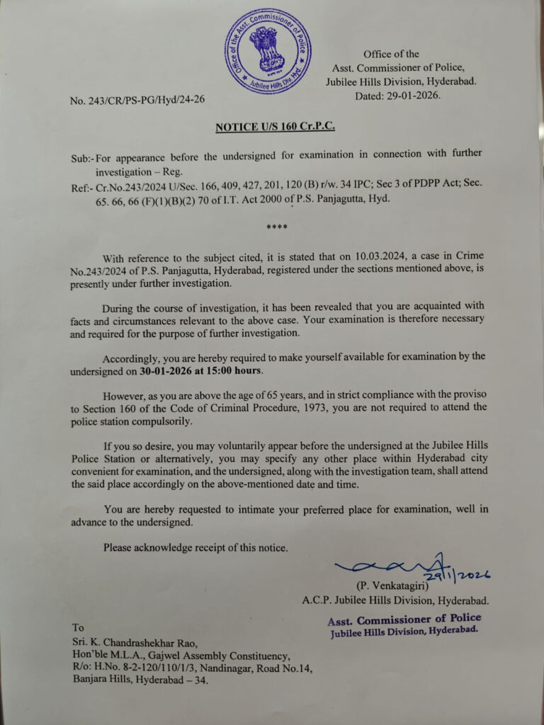 As per the notice, KCR will be questioned at his Erravalli farmhouse in Siddipet from 3 pm onwards on Friday, instead of the Jubilee Hills police station in Hyderabad, citing his age.