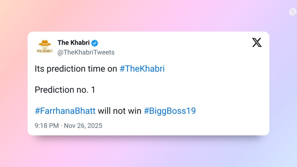 A viral tweet from popular social media handle The Khabri has sparked major curiosity among fans. The post claims that one of the season’s most talked-about contestants, Farrhana Bhatt, will not be the winner of Bigg Boss 19. What’s adding fuel to this buzz is the credibility attached to The Khabri, whose past predictions in previous seasons have turned out to be surprisingly accurate.