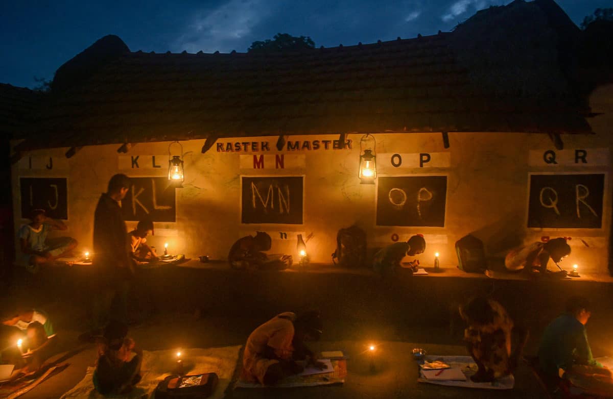 West Burdwan: Tribal children study using kerosene lamps during a class conducted after the sunset, by ‘Teacher of Streets’ Deep Narayan Nayak, at Namu Jamdoba village in West Burdwan district, Tuesday, May 10, 2022. Villagers residing in this tribal village are mostly daily wage earners and are living with hardship without any electricity. (PTI Photo/Swapan Mahapatra)