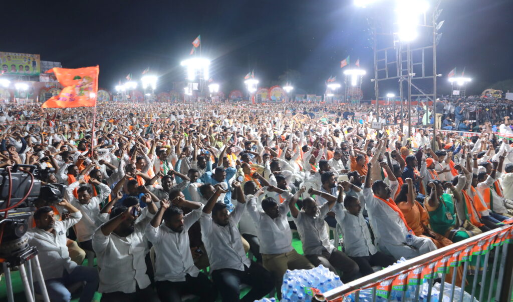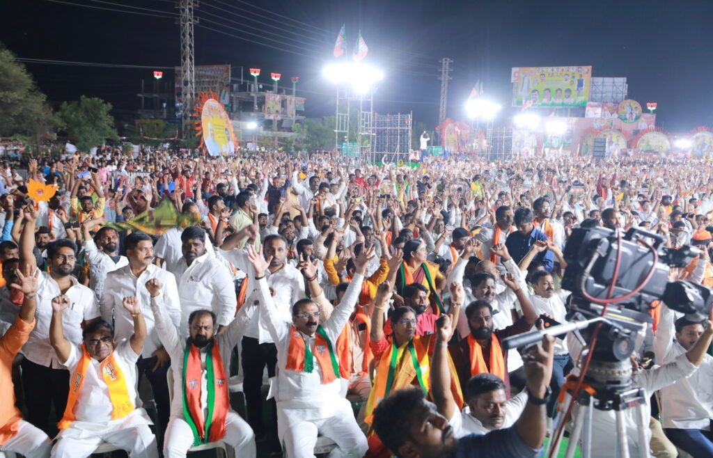 Chevella: Union Home Minister Amit Shah being welcomed as he arrives to address the ‘Vijay Sankalp Sabha’ ahead of the Karnataka Assembly elections, in Chevella, Sunday, April 23, 2023. (PTI Photo)