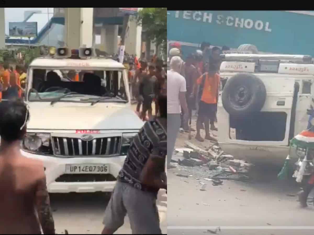 In yet another incident of violence, a group of enraged Kanwariyas vandalized and overturned a police vehicle after it allegedly entered a lane designated for the pilgrimage procession.