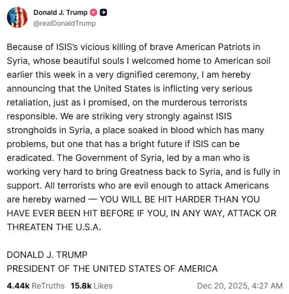 Trump in a social media post said the strikes were targeting IS “strongholds.” He reiterated his support for Syrian President Ahmad Al-Sharaa, who he said was “fully in support” of the US effort to target the militant group.