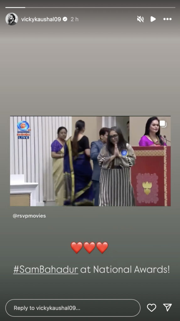 Vicky took to Instagram stories, where he shared a video of Meghna Gulzar receiving the honour at the award event held in the National Capital on September 23.