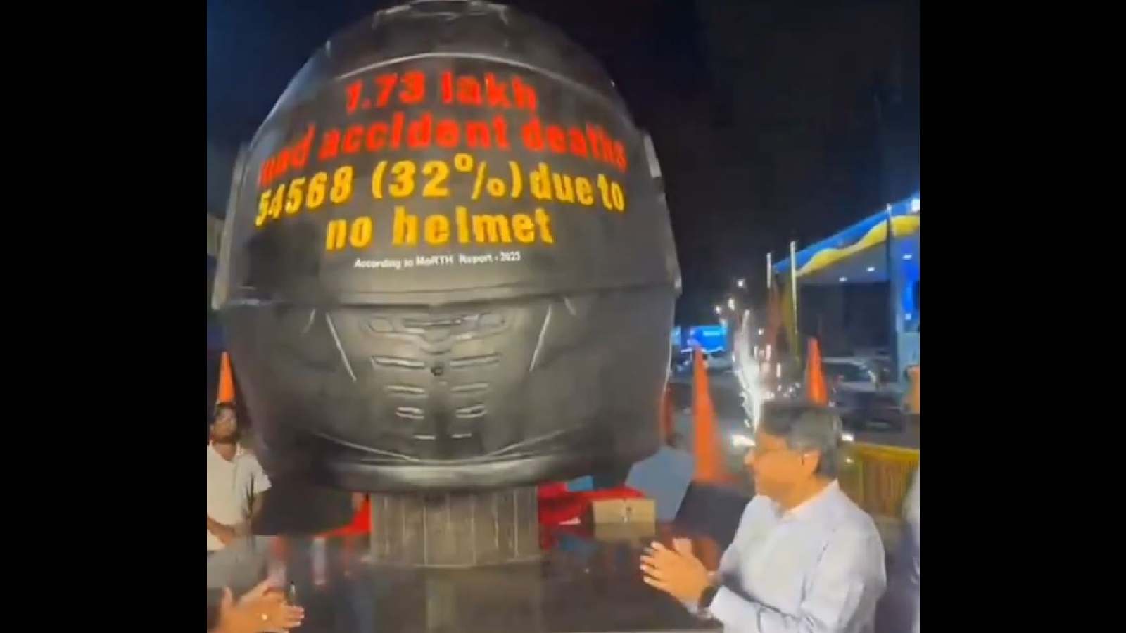 The replica was installed in collaboration with the Sarvejana Foundation. Data from a 2023 report was printed on the helmet, “1.73 lakh road accident deaths in India; 54,568 (32 per cent) deaths due to no helmet,” it read.