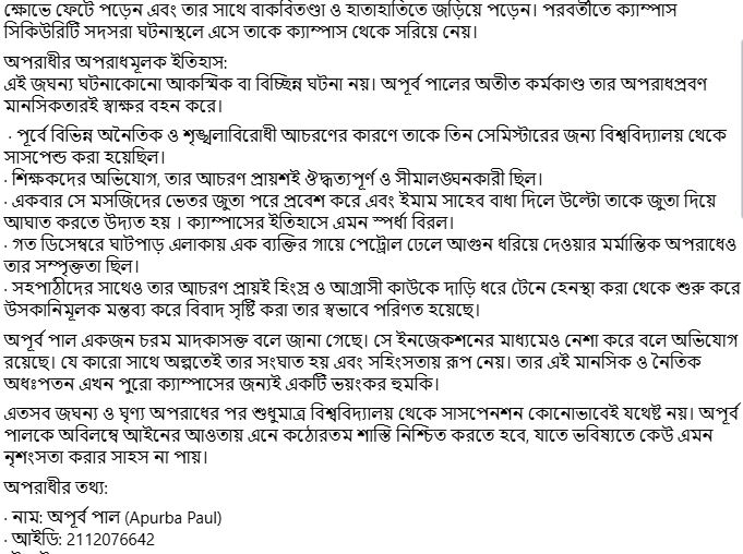 According to The Daily Observer, the NSU Islam Practitioners Facebook page detailed the morning’s events, describing how Apurba “deliberately placed the Holy Quran on the ground, kicked it, tore out its pages and recorded a video”.