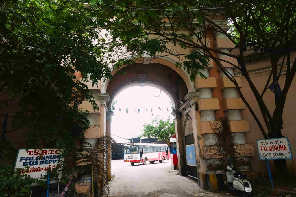 The walk began at the lofty arched gate of what is now the Falaknuma Bus Depot—a modest yet powerful symbol of the grandeur that once defined the Jahanuma area. In its prime, this site was a lush garden, a serene sanctuary in the bustling cityscape, with towering trees and well-laid paths welcoming visitors. Today, urban development has transformed it, but the grand arched gate remains, a silent testament to the opulence of a bygone era. This gate, one of only three surviving structures in Jahanuma, now marks the bus depot entrance, though it once welcomed visitors to a secluded paradise. Nearby, an opulent palace once crowned the area, demolished nearly 70 years ago, now survives only in the photographs captured by Raja Deen Dayal, a renowned photographer employed by the Nizam.