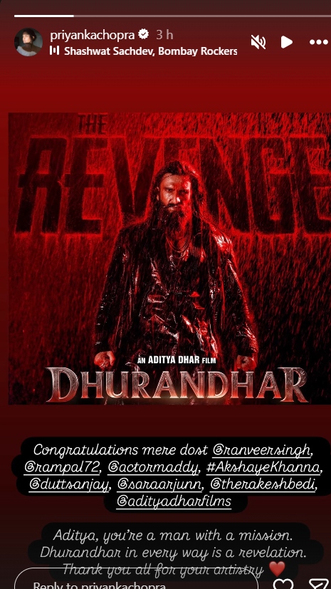 Praising filmmaker Aditya Dhar, Priyanka wrote that he is “a man with a mission,” adding that ‘Dhurandhar’ is “a revelation in every way.”