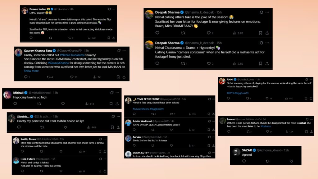 Another fan tweeted, “LMAO exactly Nehal’s ‘drama’ deserves its own daily soap at this point! The way she flips every situation just for camera time is pure acting masterclass. Sacrifice for TRP, tears for attention — she’s in full overacting ki dukaan mode this week.”