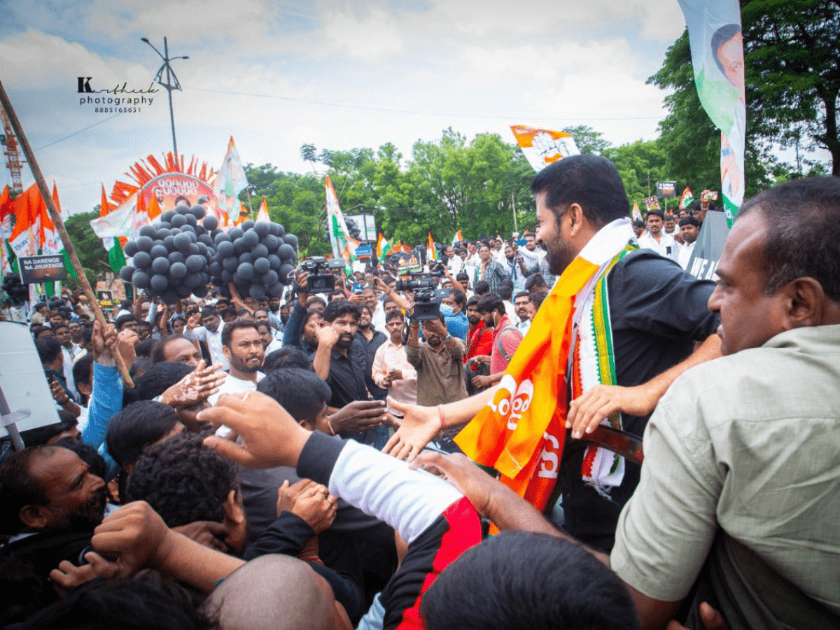“We want Sonia Gandhi to know that we have taken responsibility to give our lives for the country. BJP wretches are alleging that she has laundered money, but Gandhi is the leader who has brought in the right to education, information, and food security. She is the leader who has fought for the poor.” Revanth passionately expressed.