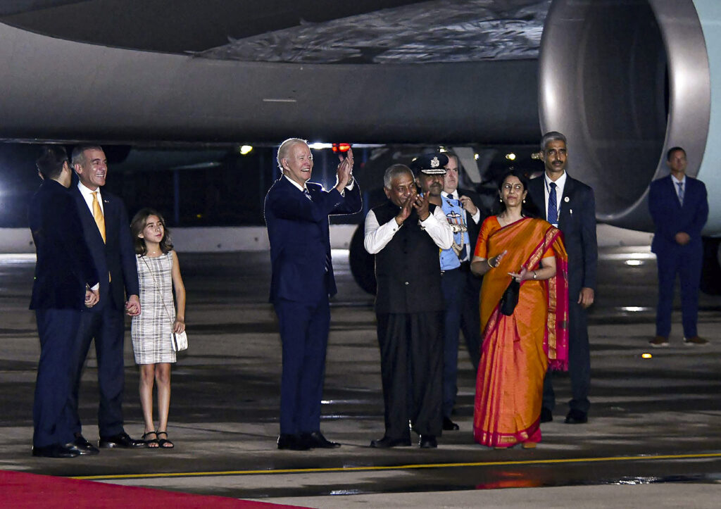 New Delhi: US President Joe Biden being received by Union Minister of State for Civil Aviation General (retd.) V.K. Singh upon his arrival for the G20 Summit, in New Delhi, Friday, Sept. 8, 2023. (PTI Photo)