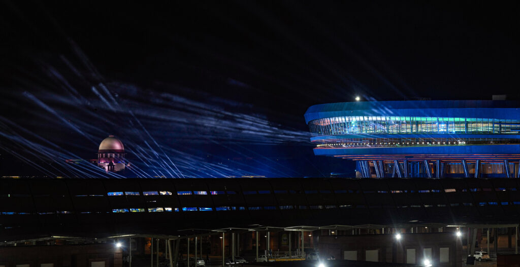 New Delhi: Bharat Mandapam illuminated with colourful lights on the eve of the G20 Summit at Pragati Maidan, in New Delhi, Friday, Sept. 8, 2023. (PTI Photo/Manvender Vashist Lav)